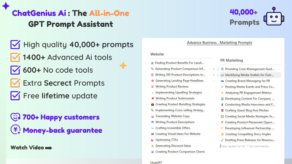 ChatGenius Ai : 40,000+ Prompts V4 | 1.4k+ Ai Tools |600+ No code Tools | AI Total Guide